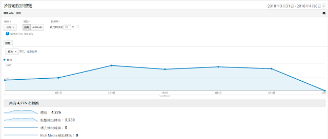 此報表可以詳細分析使用者的轉換路徑,在報表上方可以看到所謂的「路徑長度」,在路徑長度中可以知道使用者都是經歷幾次點擊才完成轉換,報表會將細節完成呈現,從這邊可以知道其實顧客的轉換路徑十分複雜,很少有一次就完成轉換。